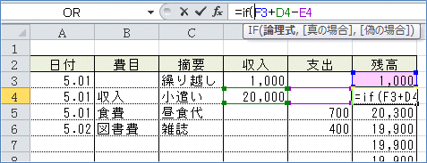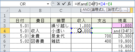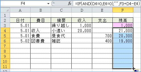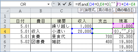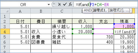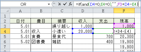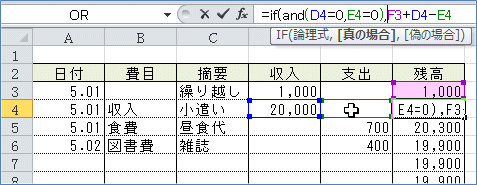 すると、まだ記載のない行にも残高が入ってしまいます。 (4)なので「収入」も「支出」もゼロだったら空白を表示して、そうでない場合に は残高の計算結果を表示させるようにします。 =IF(論理式,真の場合,偽の場合)ですから =IF(AND(D4=0,E4=0),"",F3+D4-E4)このような式になります。 (5)(2)で入力したF4セルの数式を利用して、(4)の式を入力してみましょう。 関数を組み合わせて使う場合は、直接数式バーで入力するほうが簡単です。 まず、F4セルを選択して、数式バーの「=」のすぐ右にカーソルを入れます。