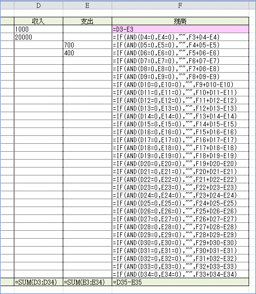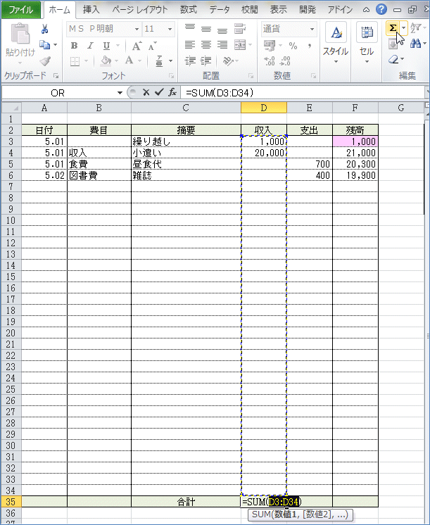 こんどは合計欄に数式を入力します。 (1)収入欄の一番上に数字を入力しておいてD35セルを選択してオートSUMボタンを クリックすると3行目から34行目までの合計の式が入ります。どんなやり方でもか まいませんから、「=SUM(D3:D34)」の式をD35セルに入れてください。