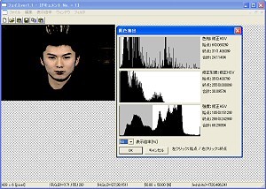 | 肌色抽出機能を追加。修正HSV表色系への変換機能を追加。tgaファイルの読み込みに対応。 プログラムは2100行オーバー! ※公開後に以下を改良しました ○色相の計算を修正 ○肌色抽出ダイアログのヒストグラムを倍率を選択して表示できるようにした |