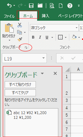 - なお、クリップボードに記憶されている内容は[ホーム]タブのクリップボードグループにあるダイアログボックス起動ツールをクリックするとシートの左側に表示されます。