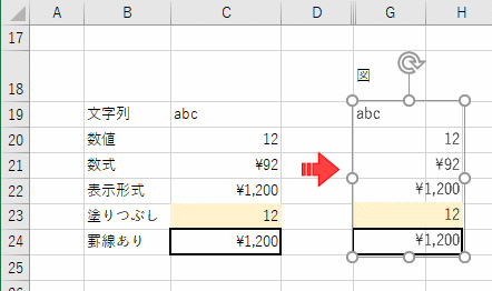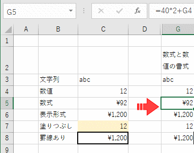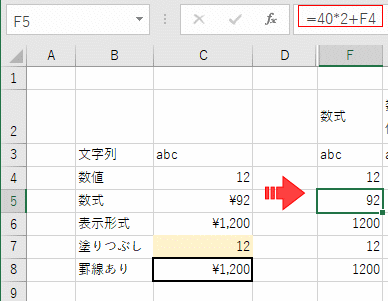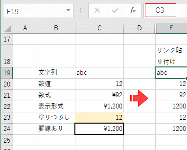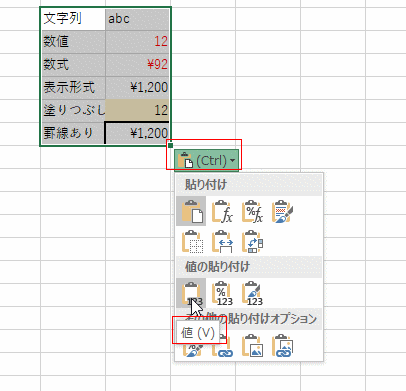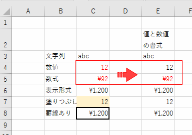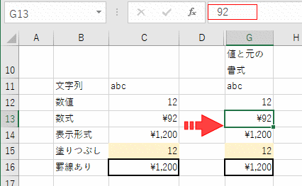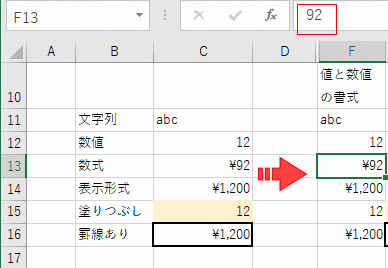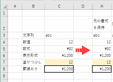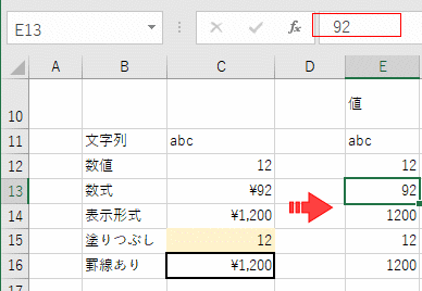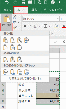 数式バーに表示される数式(又は値)が貼り付けられます。つまり、数値や文字列は書式などが除かれて貼り付けられます。