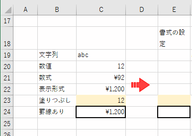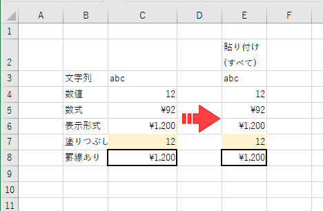 セルに設定されている書式(塗りつぶしや罫線)が貼り付けられます。セルの値は無視されます。