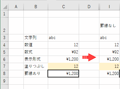 下図の5,6行目の表示形式(通貨スタイル、カンマ区切り)がなくなり、7,8行目のセルの書式(塗りつぶし、罫線)がなくなっています。