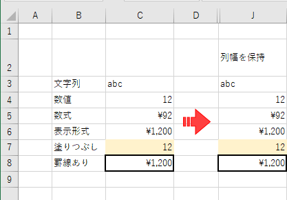 列幅が保持された状態で貼り付けられます。列幅に関係するのはこのコマンドだけです。