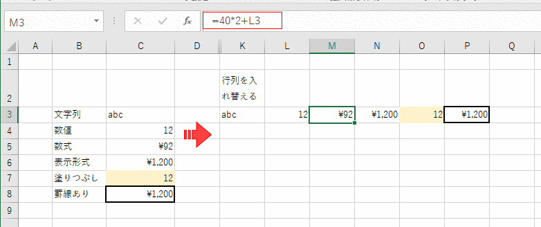 行と列を入れ替えた状態で貼り付けられます。数式もこの位置関係が保持されています。