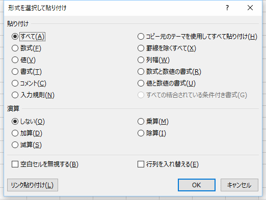 - 形式を選択して貼り付けは Ctrl + Alt + V でダイアログボックスを表示することができます。