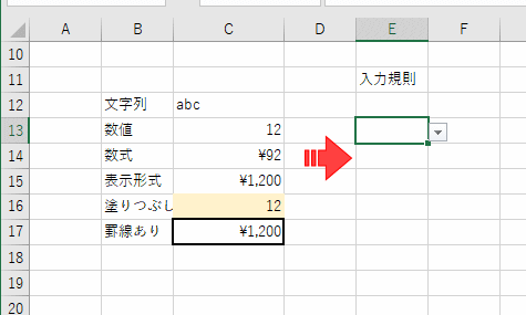 コピー元に設定されている入力規則が貼り付けられます。下図では 数値のところに設定されている入力規則のリストがコピーされています。