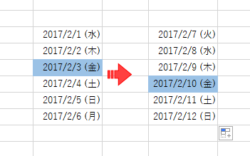 下図は左のセル範囲をコピーして貼り付けたのち、日付を2/7〜2/12に変更したものです。