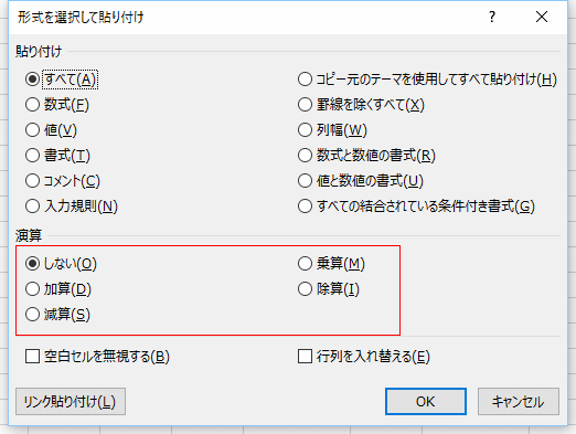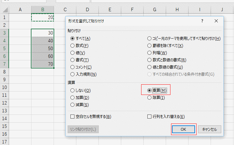 [乗算]のチェックを入れて、[OK]ボタンをクリックします。キー操作は M Enter で実行できます。
