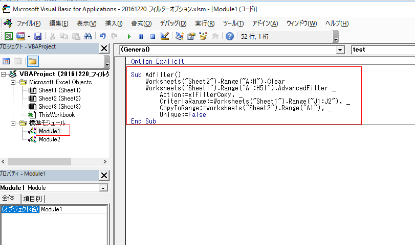 | Sub Adfilter() Worksheets("Sheet2").Range("A:H").Clear Worksheets("Sheet1").Range("A1:H51").AdvancedFilter _ Action:=xlFilterCopy, _ CriteriaRange:=Worksheets("Sheet1").Range("J1:J2"), _ CopyToRange:=Worksheets("Sheet2").Range("A1"), _ Unique:=False End Sub |