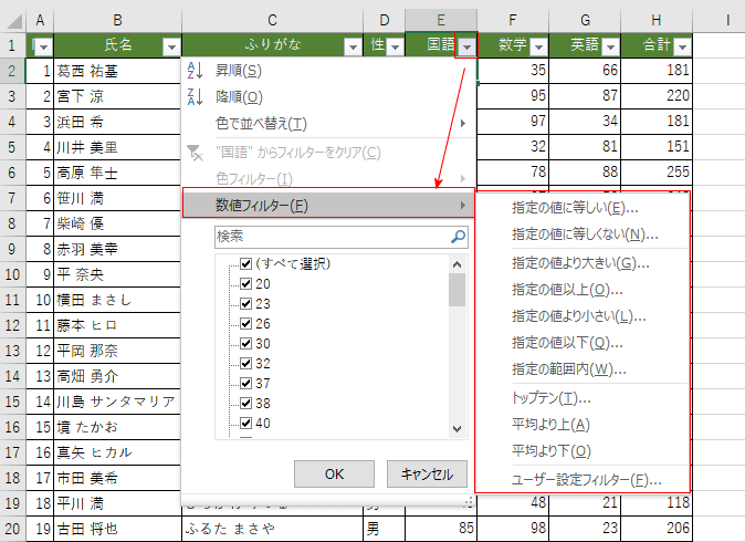 Home|エクセルの使い方の目次|オートフィルターの数値フィルターを使う