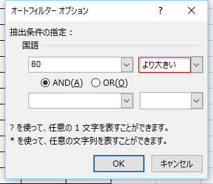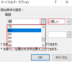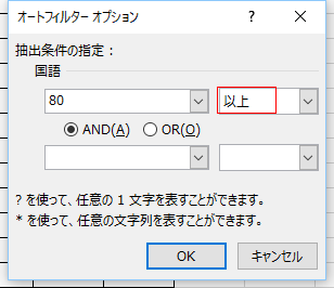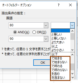 - オートフィルター オプション ダイアログボックスが条件を指定するものになりますが、このダイアログボックスは数値フィルター専用ではなく、テキストフィルターでも使います。