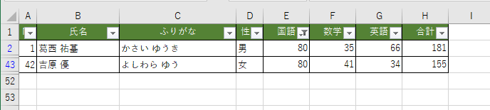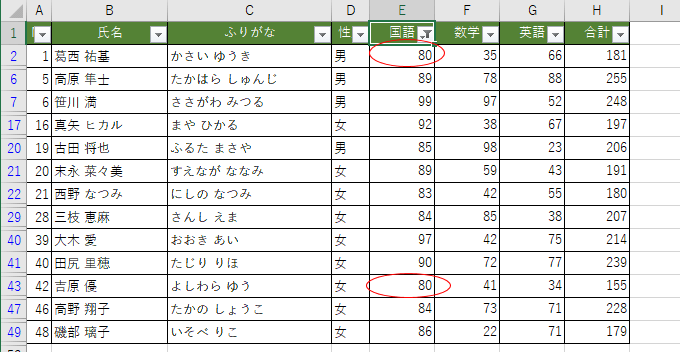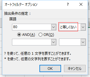 「80」「と等しくない」に該当するデーターが抽出されます。