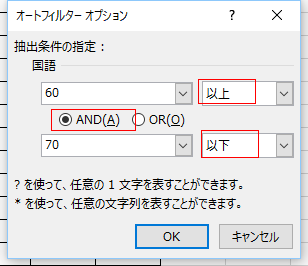 「60」「以上」 「AND」 「70」「以下」に該当するデーターが抽出されます。