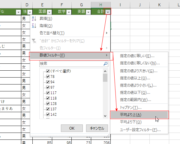 - 「平均より上」を選択すると、すぐにデータが抽出されます。