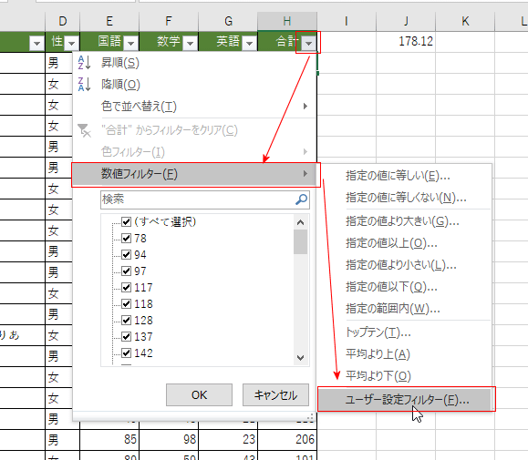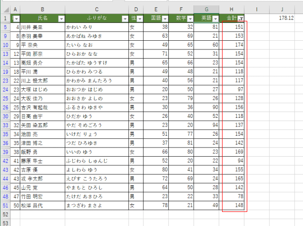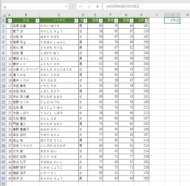 平均より上のデータが抽出されました。なお平均値はJ2セルの計算したように178.12です。
