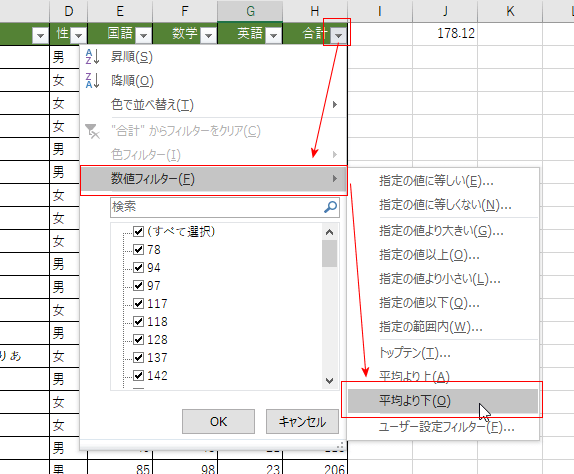 平均より下のデータが抽出されました。なお平均値はJ2セルの計算したように178.12です。