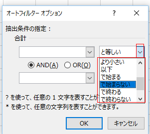 - また、条件の指定でドロップダウンリストに表示される「で始まる」〜「を含まない」はテキストフィルターの時に指定できるものです。
