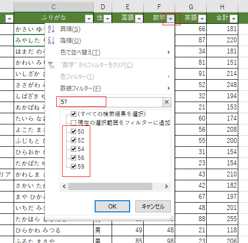 検索ボックスに 5? と入力すると、5で始まる2文字のデータがリストアップされます。