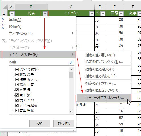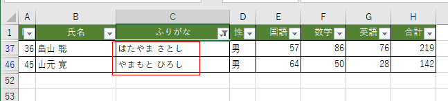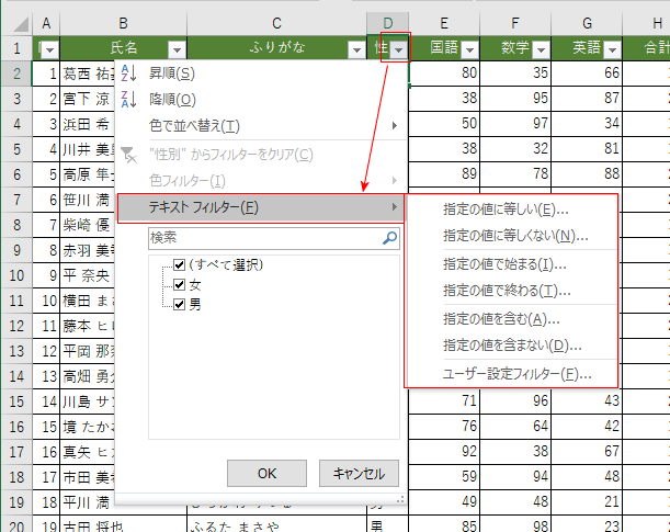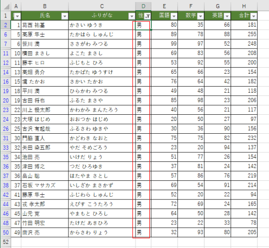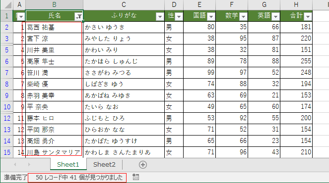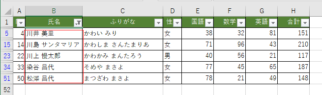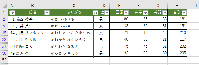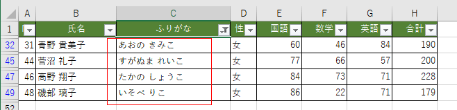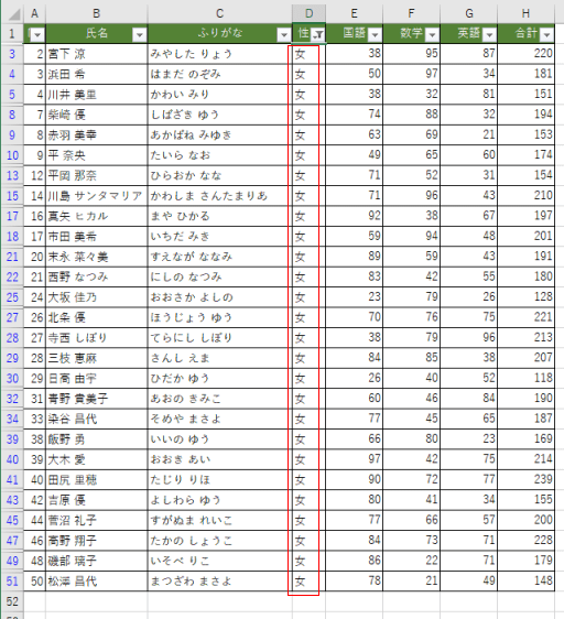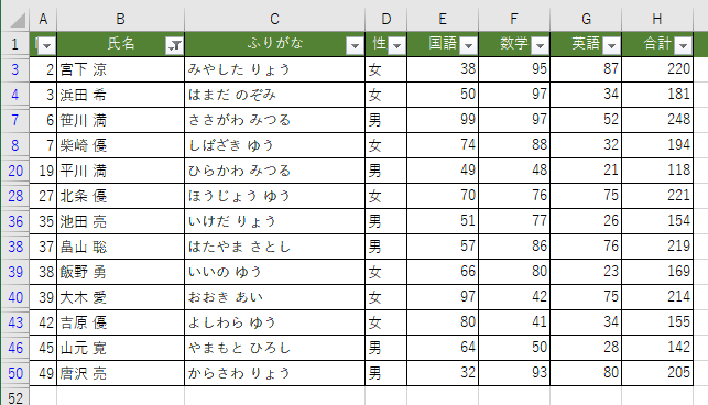 | No | 氏名 | ふりがな | 性別 | 国語 | 数学 | 英語 | 合計 |