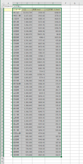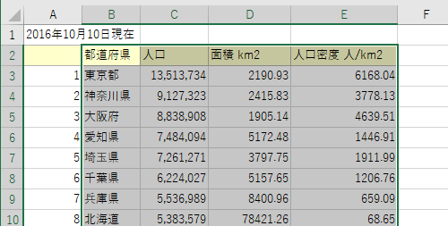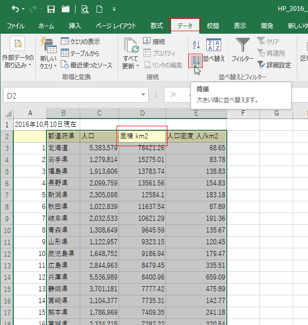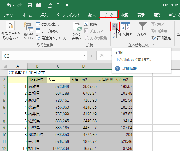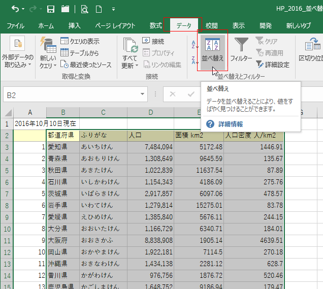 - 下表は2016年の人口データです。これを使っていろいろな順番にデータを並べてみましょう。