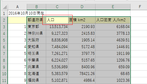 人口の列を昇順に並べ替えるので、[Tab]キーを押してC2セルをアクティブにします。