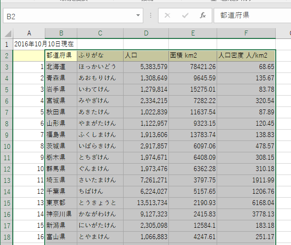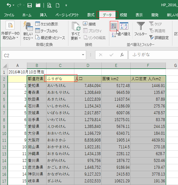 - 50音順に並べ替えるには、都道府県の振り仮名が必要になります。