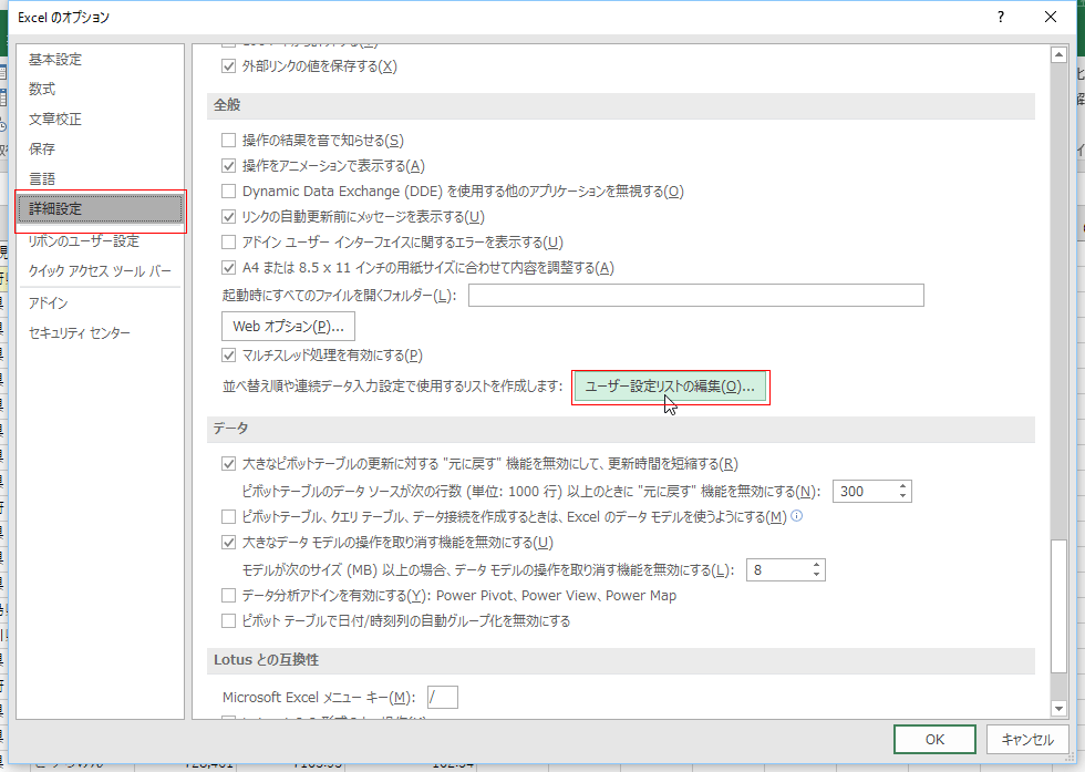 「詳細設定」を選択して「ユーザー設定リストの編集」をクリックします。