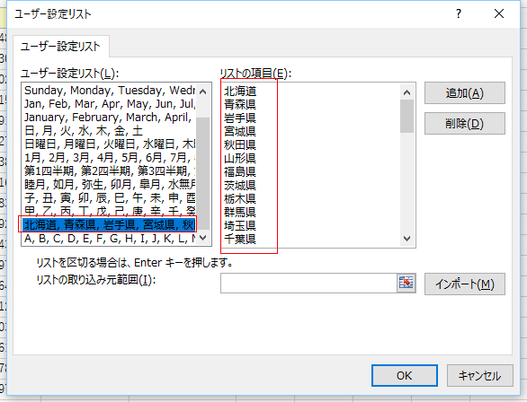 - リストの項目に北から順番に都道府県名を入力して「ユーザー設定リスト」に登録しておく必要があります。