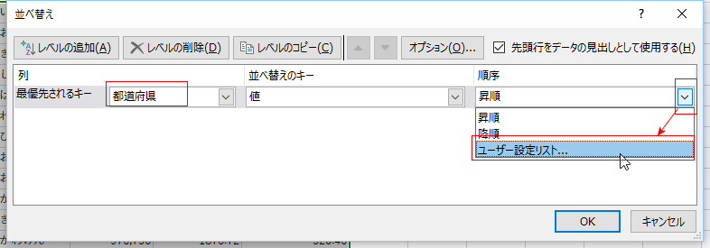 - 並べ替え」ダイアログで最優先されるキーで「都道府県」を選択します。