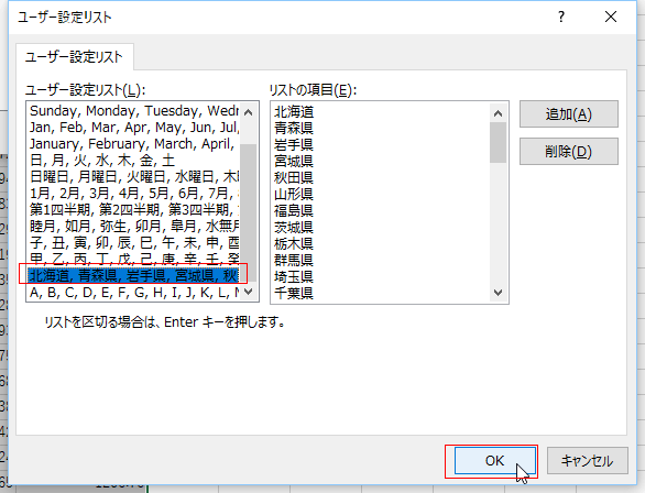 - ユーザー設定リスト が表示されるので、都道府県名を北から並べたリストを選択し、[OK]ボタンをクリックします。