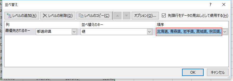 - 並べ替え ダイアログに 北から並んだ県名が表示されているのを確認して[OK]ボタンをクリックします。