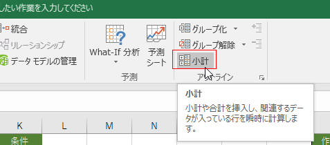 - データリスト内のセルを1つ選択した状態で、[データ]タブの[小計]をクリックします。