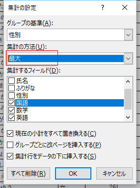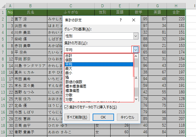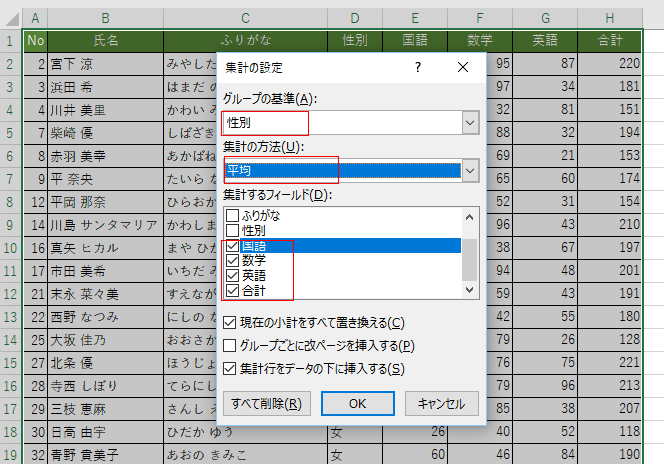 - グループの基準で「性別」、集計の方法で「平均」、集計するフィールドで「国語」「数学」「英語」「合計」のチェックを入れました。