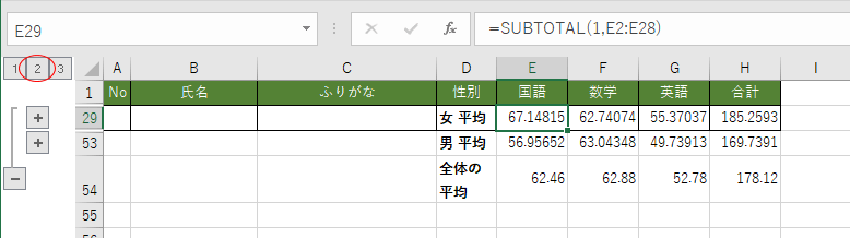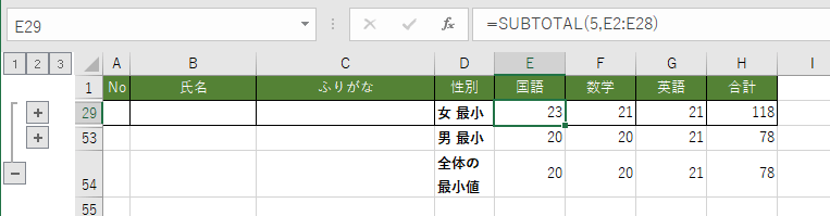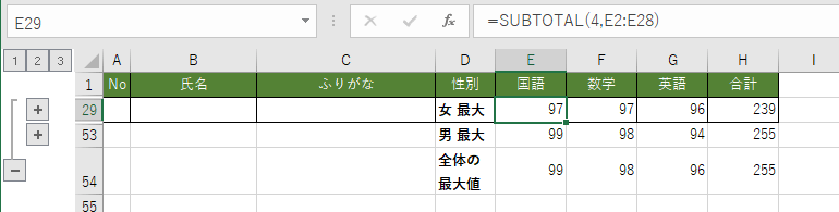 - 集計の結果はSUBTOTAL関数で挿入されます。