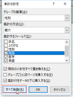 - 集計の解除は、[データ]タブの[小計]をクリックして、集計の設定で「すべて削除」をクリックします。