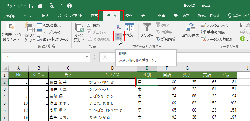 [データ]タブの[降順]を実行します。([昇順]でも[降順]でもどちらでも構いません。