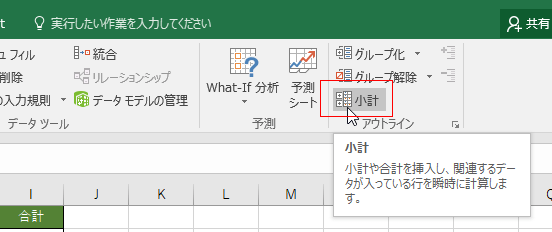 リスト内のセルを1つ選択した状態で、[データ]タブのアウトライングループにある[小計]を実行します。