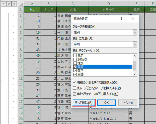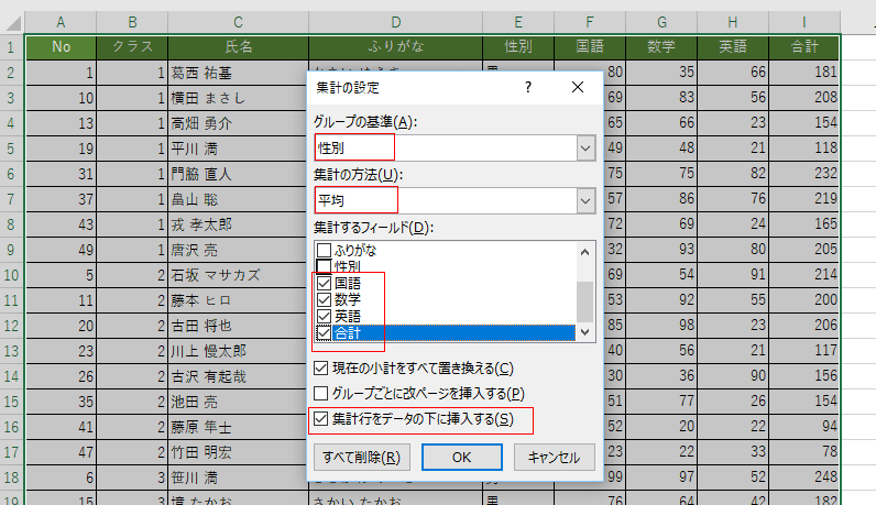 グループの基準で、「性別」、集計の方法で「平均」を選択しました。