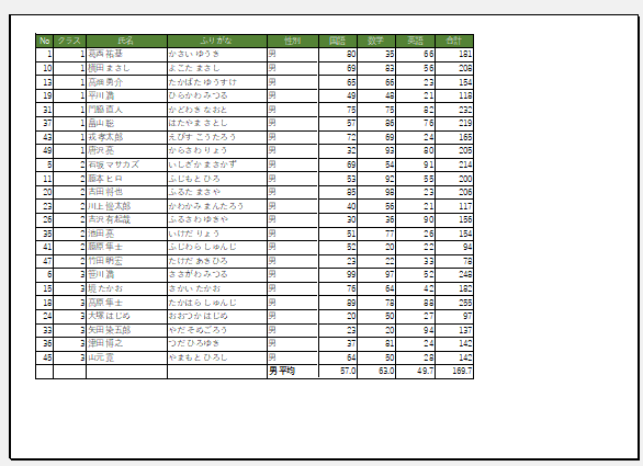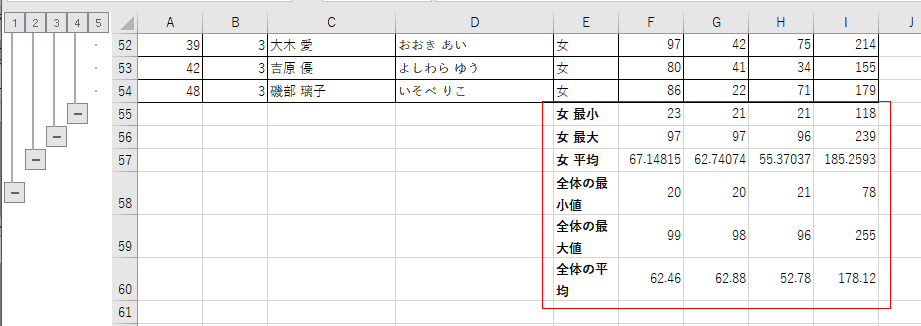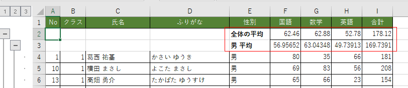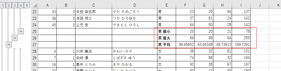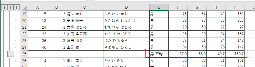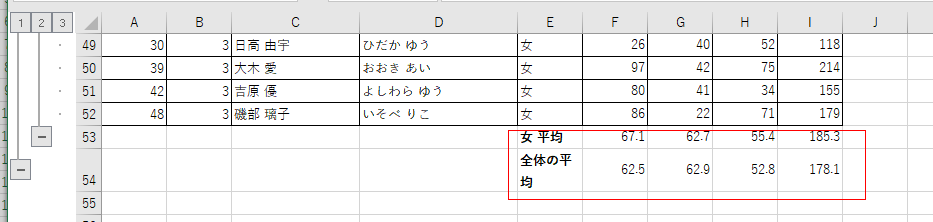 - 「男」や「女」のデータの最終行に集計(平均)値が挿入されます。なお、桁数は小数点以下1桁に調整しています。