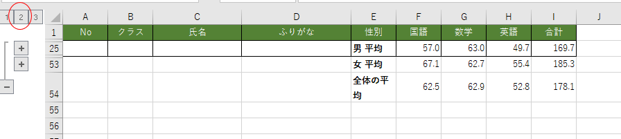 - アウトラインの「2」をクリックして、データを折りたたむことができます。