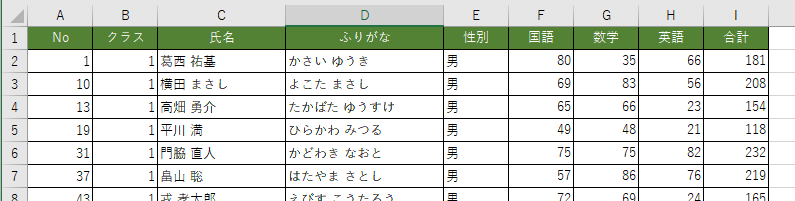 例えば、下図のようなクラ順準に並んだデータがあります。男女別の集計をしたいときは下記の手順になります。