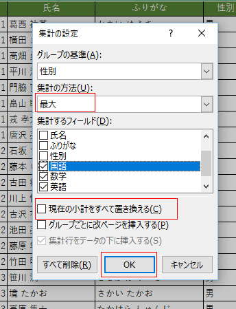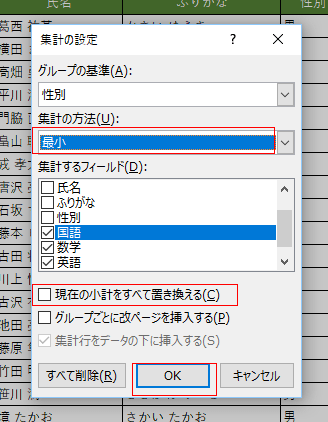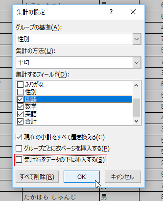 「集計行をデータの下に挿入する」にチェックが入っている」のを確認します。