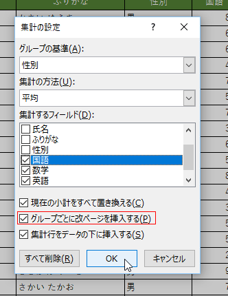 - 「グループごとに改ページを挿入する」にチェックを入れます。