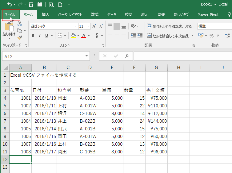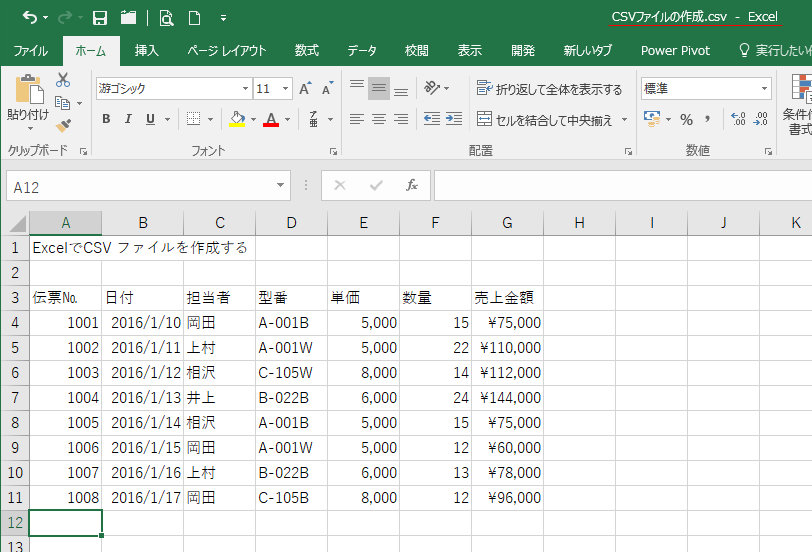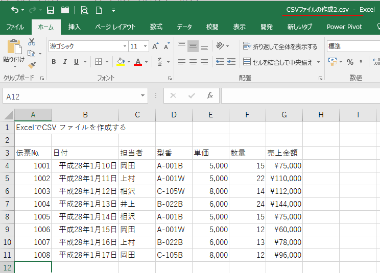 - タイトルバーに入力したファイル名が表示されます。作成したCSVファイルがExcelで開かれた状態です。