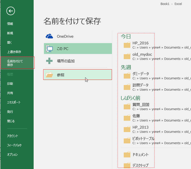 最近使用したフォルダー(場所)であれば右のほうに「今日」「先週」「しばらく前」といった区切りで表示されますので、その中から選択することができます。