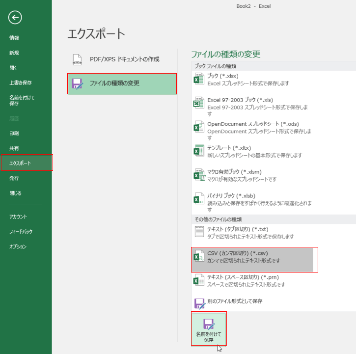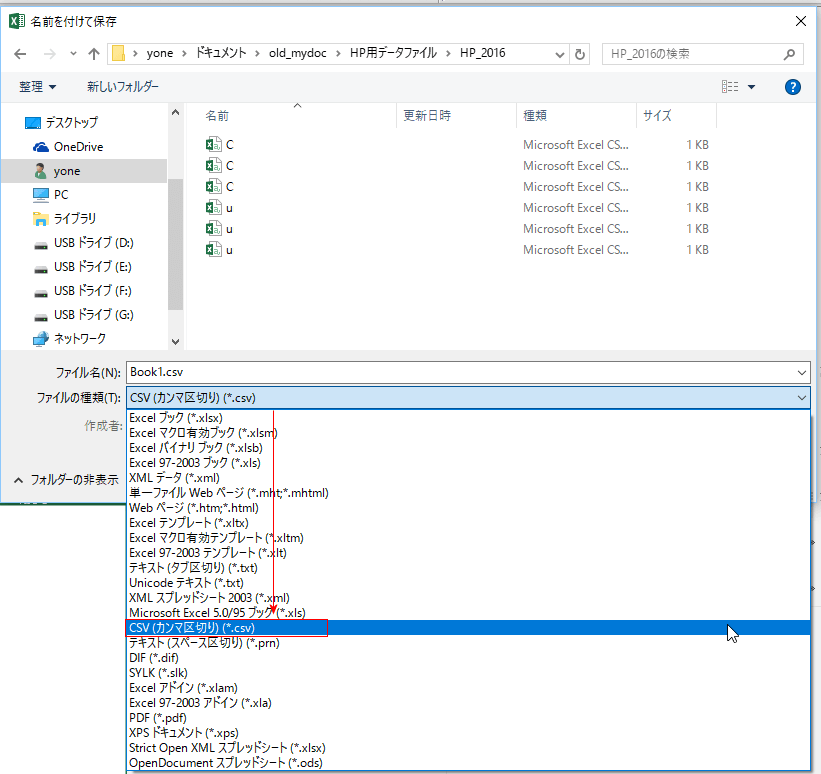 「CSV(カンマ区切り)(*.csv)」を選択します。