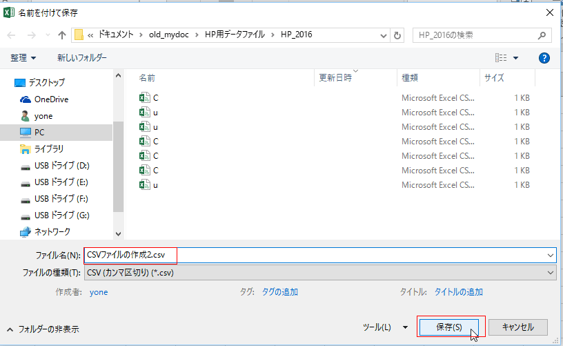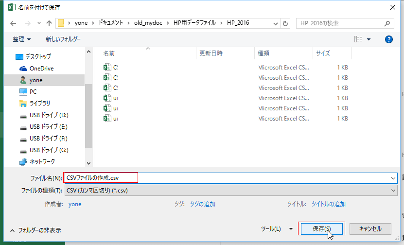 - ファイルの種類が 「CSV(カンマ区切り)(*.csv)」となった状態で名前を付けて保存 ダイアログボックスが開きます。