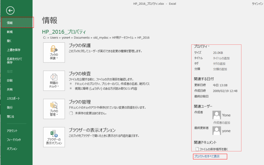 ファイル タブをクリックして、バックステージビューで情報を選択すると、プロパティが変更されたのを確認できます。