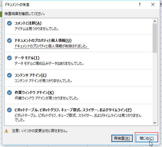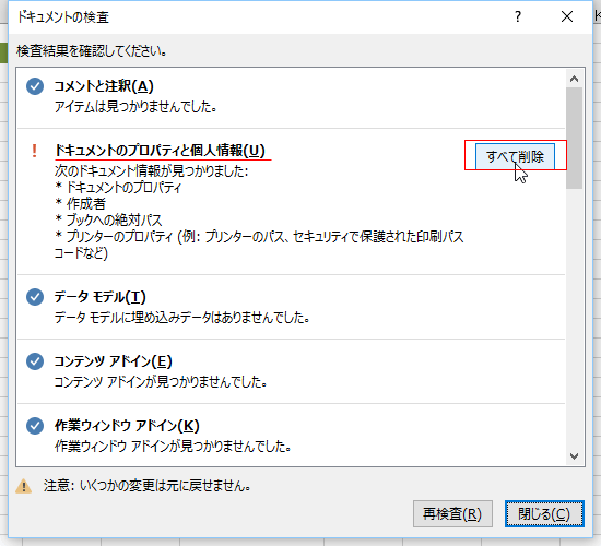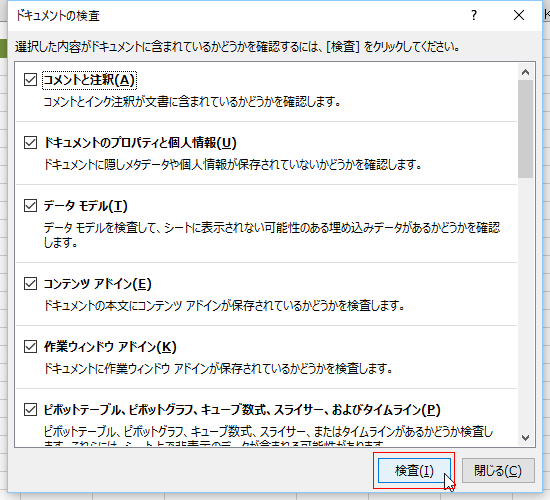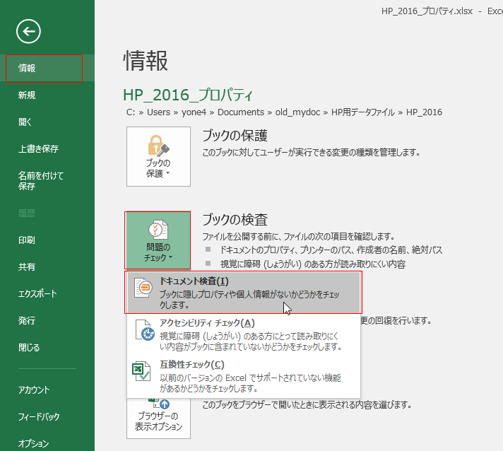 「ブックの検査」のところにある「問題のチェック」ボタンをクリックし、「ドキュメントの検査」を選択します。